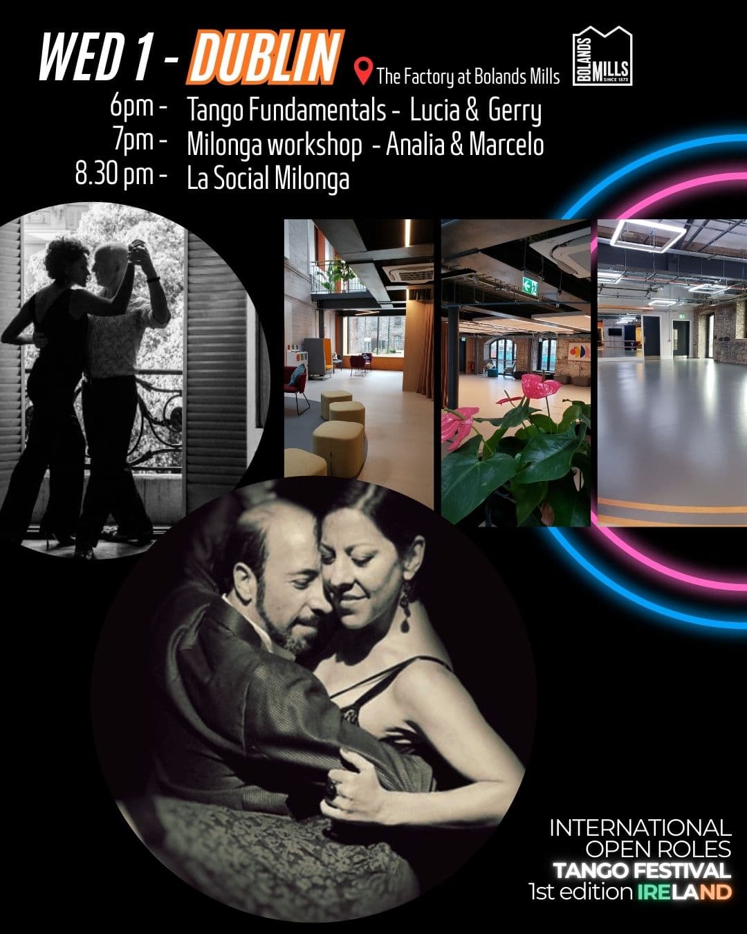 Join us for the opening night of the International Open Roles Tango Festival at The Factory at Bolands Mills, a stunning space by the canal!